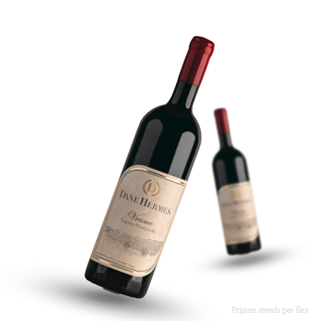 Dane Hermes Vranec is een volle, expressieve rode wijn uit de zonrijke Balkanregio, waar de Vranec‑druif al eeuwenlang wordt gekoesterd. Dankzij het warme klimaat, de stenige bodems en de natuurlijke concentratie van de druif ontstaat een wijn met indrukwekkende diepgang, rijp fruit en een fluweelzachte structuur. Dane Hermes staat bekend om zijn moderne, zuivere stijl en tilt deze inheemse druif naar een hoger niveau.